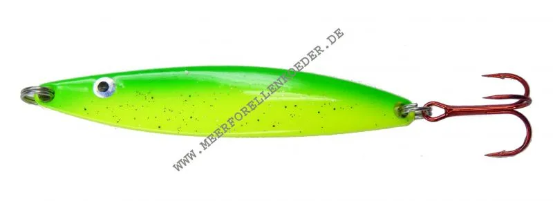 Das Wort Spigg kommt aus dem Dänischen und heißt soviel wie kleiner Stichling. Und in vielen Regionen gehört der Stichling zur Lieblingsbeute der Meerforellen. Aber das heißt nicht das man mit dem Blinker nur dort fischen kann wo es Stichlinge gibt, sondern der Grizzly imitiert auch andere Kleinfische wie Sprotte, kleiner Hering oder auch Aalmutter.  Der Grizzly Spigg ist ein kleiner Blinker für Meerforelle, Hornhecht, Wolfsbarsch und Forelle in der Ostsee oder/und im Fluß. Der Blinker wird aus feinstem Edelstahl ausgestanzt  und dann mit erprobten Farbkombinationen in Top Qualität von Hand lackiert. Alle Blinker sind mit erstklassigen rostfreien Splitringen und starken Drillingshaken ausgestattet.