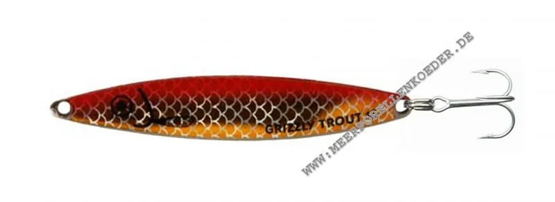 Der Grizzly Trout ist ein klassisch ausgeformter Blinker, der extrem fängig für Meerforelle, Dorsch, Hornhecht, Wolfsbarsch ,Forelle und Lachs in Seen und Fliessgewässern ist. Der Blinker wird aus feinstem Edelstahl ausgestanzt, wonach er mit einer Reflex Schuppenmusterfolie beklebt und dann mit erprobten Farbkombinationen lackiert wird. Alle Blinker sind mit erstklassigen rostfreien Splitringen und starken Drillingshaken von Mustad ausgestattet.