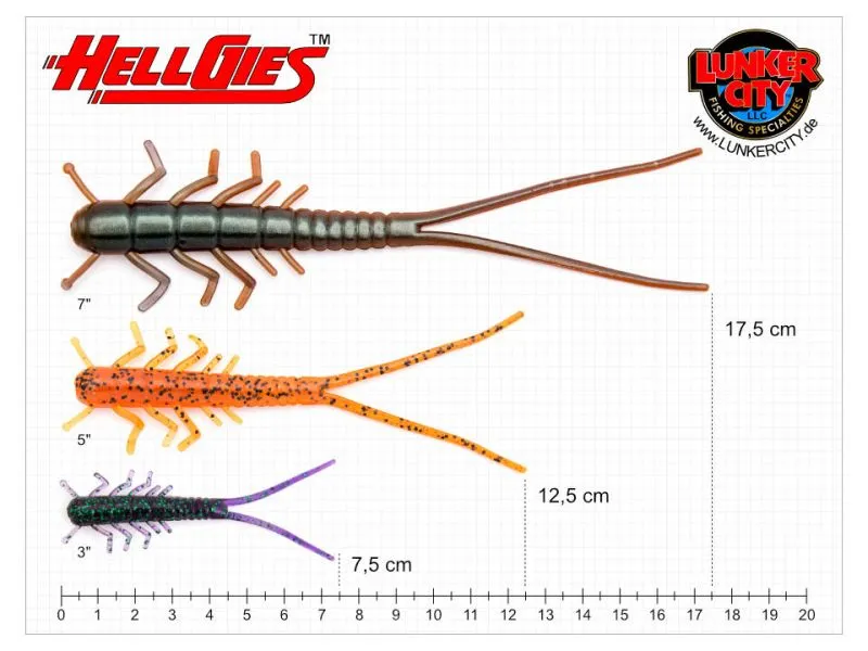 Der Hellgies hat ein von im Wasser lebenden Larven inspirierte Design. Einen Besonderen Reiz auf die Räuber haben die 'lebendig' wirkenden Beine und den Doppelschwanz. Dieser Bewegungen sprechen den Raubinstinkt der Fische an, die auf eine leichte Beute hoffen. Die Gummiköder von Lunker City sind seit sehr vielen Jahren erfolgreich nicht nur auf dem amerikanischen sondern auch auf dem Deutschen Markt etabliert. Es gibt sie in verschiedenen Designs und in einer unschlagbaren Farbauswahl. Beliebt und geschätzt werden die Gummikreationen wegen der haltbaren, aber trotzdem weiche Gummimischung.