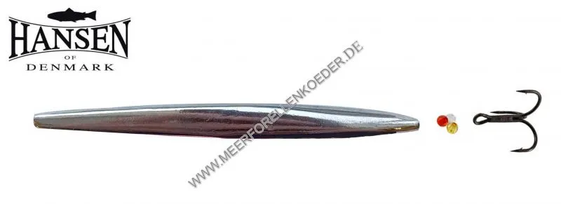 Durch das zusätzliche Gewicht am Schwanz wirft der Mefo-Inliner sich auch super gegen den Wind. Beim Spinstop sinkt der Meerforellenblinker zuerst mit dem Heck ab, so wie echte Tobiasfische die sich im Sand eingraben wollen. Durch diesen Reiz wurden schon viele Meerforellen überlistet. Die neuen Hansen Durchlaufköder werden mit 3 Stück Knotenschutzperlen und super scharfen BKK Drilling mit Sprengring im Blister geliefert. Die Hansen Silver Arrow Inline Blinker sind einzeln verpackt.