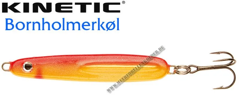 Der Kinetic Bornholmerkøl ist ein flacher Blinker mit einer angegossenen Flosse. Er hat die Form der Originalen Bornholmer. Die Köder lassen sich sehr gut werfen und zeigen beim Spinstop ein verführerisches abtaumeln. Die Kinetic Bornholmerkøl Blinker sind nur mit besten Komponenten ausgestattet wie z.B. VMC 9649 BN Drillingen. Der Bornholmerkøl imitiert ein kleines Fischchen und hat er schon viele Meerforellen und Dorsche überlistet.