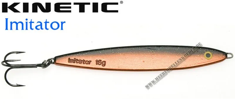 Der Kinetic Imitator ist ein flacher Blinker der zu Ende hin dicker wird. Durch dieses Zusatzgewicht am Schwanzende lassen sich die Köder sehr gut werfen und zeigen beim Spinstop ein verführerisches abtaumeln.Dieser Köder wurde für den Spinstop entwickelt. Kein anderer Köder sinkt verführerischer ab. Die Kinetic Imitator Blinker sind nur mit besten Komponenten ausgestattet wie z.B. VMC 9649 BN Drillingen. Der Blinker imitiert einen kleinen Sandaal und sollte immer mit Spinstop gefischt werden.