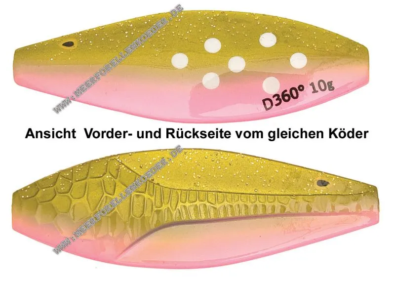 Die Forelle 10g -Version ist für Put & Take- Angeln am Forellen See konzipiert. Wenn die Fische vorsichtig beißen kann der D360 °mit extrem langsamen Tempo gefischt werden. Die verschiedenen Kontrastfarben auf Vorder und Rückseite machen oft auch einen großen Unterschied aus. Aber auch beim Fang von wilden Forellen in alpinen Seen ist dieser kleine D360 ° ist einen Versuch wert.