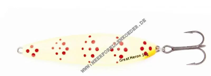 Das besonder an diesem neuen Wobbler ist die stark ausgeprägte S-Form, dadurch hat der Köder ein sehr lebhaftes Spiel und viel Aktion. Der Great Heron Wobbler imitiert eine kleine lebendige Sprotte oder einen Herring und ist daher sehr fängig bei der Jagt auf die Meerforelle. Der Wobbler wurde vom Kinetic Team viel getestet bevor er in 2010 in Produktion ging. Der Great Heron ist nur mit besten Komponenten ausgestattet wie z.B. VMC 9649 BN Drillingen. In seinem "Geburtsland" Dänemark hat er schon viele Wolfsbarsche , Meerforellen , Hornhechte  und Dorsch überlistet.
