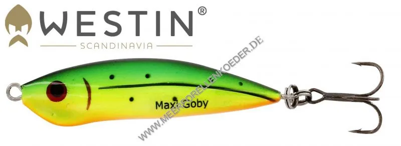 Bei der Entwicklung des Westin Mini Goby war es die Aufgabe einen sehr leichten Wobbler zu entwickeln mit dem man auch große Distanzen werfen kann. Der Maxi Goby ist eine größere, aber auch sehr andere Version des Mini Goby Wobblers. Auch dieser Meerforellenkoeder wurde von Tom Schmidt konzipiert. Weil so viele Meerforellen, Seeforellen und Saibling mit dem Mini Goby gefangen wurden, haben sich viele Angler eine größere Version gewünscht. Mit der Einführung der Maxi Goby erfüllen wir ihren Wunsch. Der Maxi Goby basiert auf dem gleichen einzigartigen Design ist aber aus ABS-Kunststoff mit integrieren Ultra-Sonic Rassel Kugeln gemacht. Die Rattle Balls sollen auch bei Trüben Wasser Forelle zum Wobbler und an den Haken locken. Seine unregelmäßige Bewegung im Wasser und das sehr langsamen Tempo mit dem der Wobbler im Flachem gefischt werden kann machen ihn unverzichtbar für jeden Meerforellenangler. Bei gelegentlichen Spin Stopps oder Pausen sinkt der Maxi Goby flatternd ab.