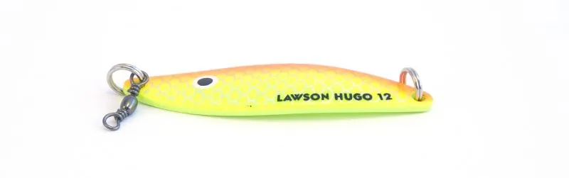 Der Hugo Blinker ist ein kleiner Blinker mit agilem Lauf. Durch die Kompakte Form kann man den Blinker auch bei Wind noch gut werfen. Alle Lawson Blinker sind mit rostfreien Sprengringen und sehr scharfen schwarzen tournament Drillingshaken ausgestattet. Es gibt den kleinen Hugo Meerforellenverführer in 10 erprobten Farben. Bei kaltem Wetter wenn die Forellen noch nach kleinen Happen jagen ist dieser Köder besonders gut aber der Hugo fängt auch im Sommer noch Meerforellen.