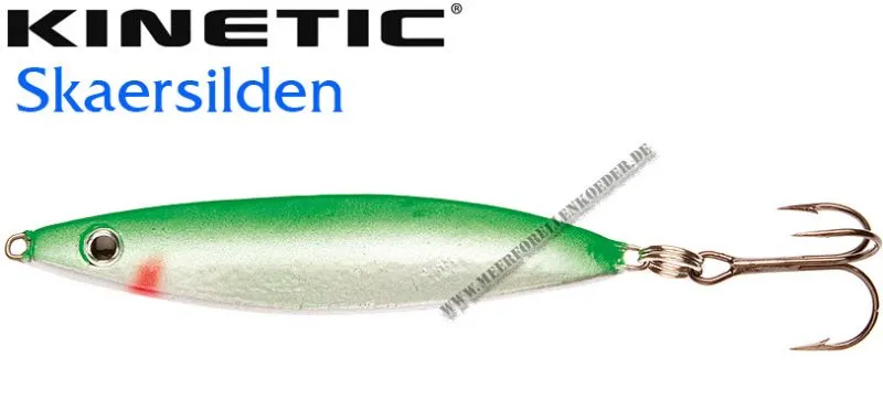 Der Kinetic Skaersilden ist ein wellenförmig geschwungener Blinker. Die Köder lassen sich gut werfen und zeigen beim einkurbeln ein verführerisch taumelnden Lauf. Die  Kinetic Skaersilden Blinker sind nur mit besten Komponenten ausgestattet wie z.B. VMC 9649 BN Drillingen. Der Skaersilden imitiert einen Hering und hat er schon viele Meerforellen überlistet. Nicht umsonst hat er den Namen " Fegefeuer ". Mit diesem Köder räumen Sie unter den Meerforellen richtig auf.