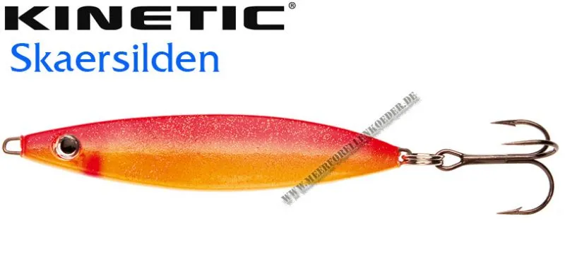 Der Kinetic Skaersilden ist ein wellenförmig geschwungener Blinker. Die Köder lassen sich gut werfen und zeigen beim einkurbeln ein verführerisch taumelnden Lauf. Die  Kinetic Skaersilden Blinker sind nur mit besten Komponenten ausgestattet wie z.B. VMC 9649 BN Drillingen. Der Skaersilden imitiert einen Hering und hat er schon viele Meerforellen überlistet. Nicht umsonst hat er den Namen " Fegefeuer ". Mit diesem Köder räumen Sie unter den Meerforellen richtig auf.