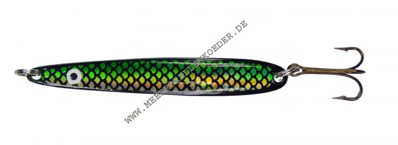 Original Flemmings Fiskegrej Blinker Sesam handmade in Dänemark. Dieser Köder ist der große Bruder vom Loke Blinker. Er ist von der Form her breiter und etwas länger als der Loke und ähnlich einem Hansen Flash.  Man kann den Sesam Blinker auch langsamer führen da er aufgrund seiner breiteren Bauform nicht so schnell durchsackt. Der dänische Meerforellenblinker macht viel Druck im Wasser und lockt die Forellen auch aus großer Entfernung noch an. Unter Wasser imitiert der Sesam kleine Fischchen wie Sprotten, Stichlinge oder Aalmuttern. Der  Blinker ist in 8 Farben erhältlich.  Alle Blinker werden mit rostfreien Sprengringen und scharfen Mustad Drillingen geliefert.