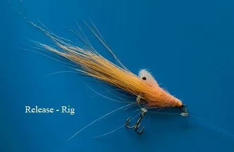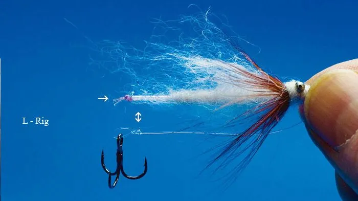 Das L-Rig ist die einfachste Form die Tuben-Fliegen zu montieren und dauert nur wenige Sekunden. Oder man fischt die Tuben als Release-Rig mit lose hängendem Haken. Die Fliege ist an einem Einzelhaken befestigt, bei dem die Hakenspitze abgeschnitten wurde.