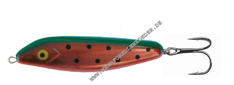Der Orginal Vicke Wobbler  aus Schweden fängt seit 25 Jahren ! super Meerforellen und Lachse . Anders als die bekannte Kopie , ist er mit weniger Rasselkugeln ausgestattet die einen dumpfen Klang erzeugen .