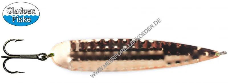 Der Gladsax Ismo Giant ist der neue Köder für ist den Fang von dicken Lachsen entlang der Ostseeküste. Er wird in Schweden gefertigt und von Hand bemalt. Am besten schleppt man den Giant zwischen 2,2 bis 2,8 Knoten. Hergestellt ist der Giant aus einem dünnen Edelstahlblech. Durch diese dünne Platte hat der Spoon viel Bewegung und einen sehr schönen Lauf. Die Form des Ismo kann man so beschreiben: der Blinker ist Hinten breiter als Vorn, leicht gewölbt und hat am Schwanz einen leichten Knick. Das Blech des Lachslöffels wird zusätzlich noch mit einem Muster geprägt. Dieses Muster erzeugt im Wasser viele Lichtreflexe und kleine Turbulenzen. Die viel getestete und erprobte Form ist zusammen mit dem geringen Gewicht sicher auch dafür Verantwortlich, dass der Köder einem einzigartigen Lauf im Wasser hat und so viele dicke Ostseelachse überlistet.