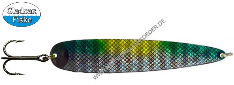 Der Gladsax Ismo Giant ist der neue Köder für ist den Fang von dicken Lachsen entlang der Ostseeküste. Er wird in Schweden gefertigt und von Hand bemalt. Am besten schleppt man den Giant zwischen 2,2 bis 2,8 Knoten. Hergestellt ist der Giant aus einem dünnen Edelstahlblech. Durch diese dünne Platte hat der Spoon viel Bewegung und einen sehr schönen Lauf. Die Form des Ismo kann man so beschreiben: der Blinker ist Hinten breiter als Vorn, leicht gewölbt und hat am Schwanz einen leichten Knick. Das Blech des Lachslöffels wird zusätzlich noch mit einem Muster geprägt. Dieses Muster erzeugt im Wasser viele Lichtreflexe und kleine Turbulenzen. Die viel getestete und erprobte Form ist zusammen mit dem geringen Gewicht sicher auch dafür Verantwortlich, dass der Köder einem einzigartigen Lauf im Wasser hat und so viele dicke Ostseelachse überlistet.