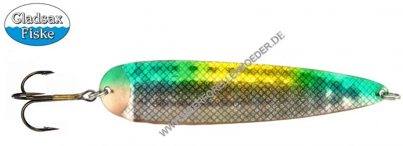 Der Gladsax Ismo Mag ist wahrscheinlich der meistverkaufte Trolling Löffel für den Fang von Lachs entlang der Ostseeküste Schwedens. Er wird in Schweden gefertigt ist von Hand bemalt und unglaublich beliebt. Am besten schleppt man den MAG zwischen 2,4 bis 3,1 Knoten. Für die Fischerei bei niedrigeren Geschwindigkeit 2,5 bis 2,7-Knoten sollte man einen Einzelhaken Größe 4/0 oder 5/0 mit 2 Sprengringen verwenden. Hergestellt ist der Ismo Magnum aus ein dünnes Edelstahl. Durch diese dünne Platte hat der Spoon viel mehr Bewegung und einen sehr schönen Lauf. Die Form des Ismo kann man so beschreiben der Blinker ist Hinten breiter als Vorn, leicht gewölbt und hat am Schwanz einen leichten Knick. Der Lachslöffel wird zusätzlich noch mit einem Muster geprägt. Dieses Muster erzeugt im Wasser viele Lichtreflexe und kleine Turbulenzen. Die viel getestete und erprobte Form ist zusammen mit dem geringen Gewicht sicher auch dafür Verantwortlich, dass der Köder einem einzigartigen Lauf im Wasser hat und so viele dicke Ostseelachse und Meerforellen überlistet.