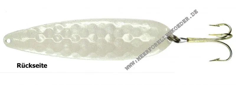 Viele Trollingangler kennen sicher noch den Kultblinker DK " Pirat " aus Dänemark. Der Pirat Schleppblinker ist ein Premium Blinker mit einer perfekten Lackierung von Ole OG-Paint ( Bornholmerpilen ). Die Form des Pirat kann man so beschreiben der Blinker ist Hinten breiter als Vorn, etwas gewölbt und hat am Heck einen leichten Knick. Der Lachslöffel wird zusätzlich noch mit einem Waffelmuster geprägt. Dieses Muster erzeugt im Wasser viele Lichtreflexe und kleine Turbulenzen. Die erprobte Blinkerform ist sicher auch dafür Verantwortlich, dass der Köder einem einzigartigen Lauf im Wasser hat und so viele dicke Ostseelachse und Meerforellen überlistet. Die optimale Schleppgeschwindigkeit für die den " Pirat "liegt im Bereich zwischen 1,9-2,5 Knoten und der Kultblinker ist somit mit vielen anderen Trollingködern einsetzbar. Die DK Pirat Trollinglöffel sind handlackiert in Denmark.