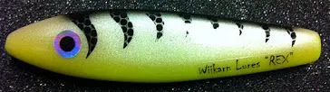 Der Name Wiikarn Lures hat einen sehr guten Ruf unter den schwedischen Trollinganglern. Hinter einem Dodger oder Flasher sind diese Lures 1.Wahl und eine richtige Geheimwaffe. Die Wiikarn REX Wobbler sind Trollingköder (8,7 cm) aus Kunststoff, entwickelt für die Fischerei auf Lachs, Forelle und Saibling in großen Seen uns an der Küste. Da die Köder wie andere Wobbler dieses Typs keine Eigenaktion haben fischt man sie am besten hinter einem großen Flasher. Der Rex Wobbler wird mit einem 80-100 cm Fluorocarbonvorfach mit einem Durchmesser von mindestens 0,50 mm hinter dem Flasher gefischt. Dann arbeitet er mit langsamen Drehungen, unregelmäßigen starten und stoppen wie ein verletzter Beutefisch. Einer Trollinggeschwindigkeit von 1,5-1,7 Knoten wird für den Winter und das zeitige Frühjahr empfohlen. Wenn das Wasser wärmer wird können Sie die Geschwindigkeit auf 2 Knoten erhöhen. REX ist ein guter Köder, wenn sich die Lachse auf relativ kleine Beutefische wie z.B. Sprotten / Brieslinge konzentrieren. Im Winter 2011-2012 wurden viele Lachse im Vätternsee auf den Rex Wobbler gefangen.