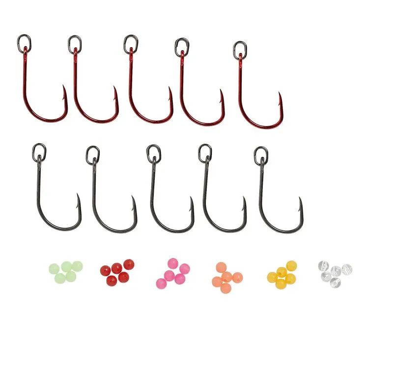 Scharfe Einzelhaken von Savage Gear im Set mit Perlen. Die Haken haben ein extra roßes Öhr und lassen sich mit dem ovalen Sprengring gut hinter Blinker oder Wobbler befestigen. Durch den Einzelhaken hat man weniger Hänger und untermaßige Fische lassen sich leichter zurücksetzen. Die Single Hooks haben eine leicht nach innen gebogene Spitze. Entwickelt für die Linethru-Köder aber auch genauso gut für alle anderen Inline Blinker und Wobbler.
