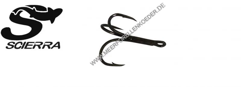Der kurzschenklige Drilling von Scierra wird aus bestem Japanischem Stahl hergestellt. Die scharfe leicht nach innen gebogene Spitze sorgt für einen sofortigen Hakeffekt.